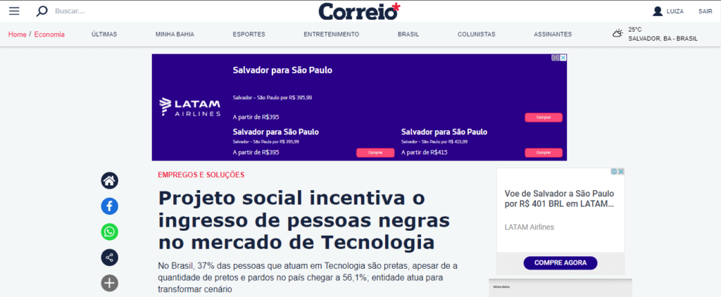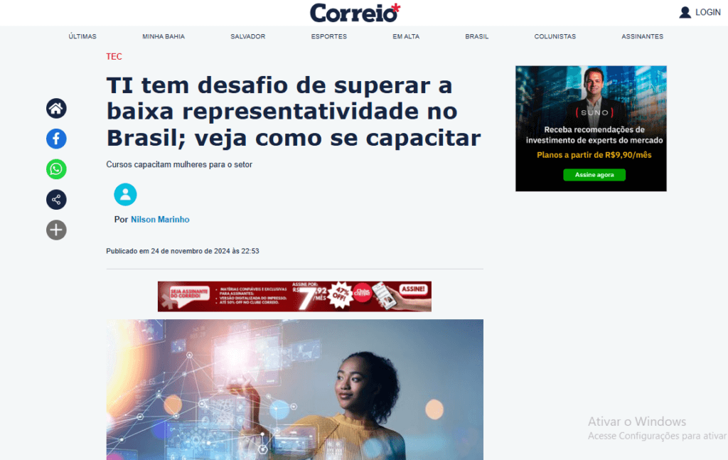 Esta reportagem publicada pelo Correio* retrata a baixa representatividade das mulheres no setor de TI e apresenta algumas iniciativas que buscam reverter este cenário. A matéria conta a história de Fabiana Costa, que se capacitou pela Escola da Nuvem e hoje segue carreira na área de TI.