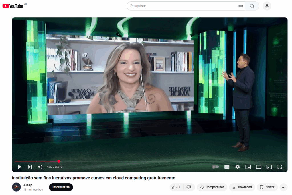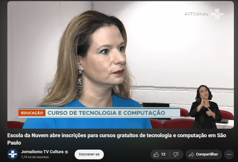 Para o programa Código Aberto, da TV Alesp, a CRO da Escola da Nuvem, Ana Letícia Lucca, teve a oportunidade de contar um pouco mais sobre o trabalho realizado pela ONG, o impacto gerado na sociedade e falou sobre os projetos futuros da organização.