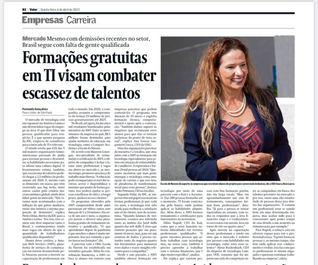 O mercado de tecnologia está em expansão na América Latina e não deve faltar vagas de emprego na área. O que deve faltar são pessoas qualificadas para ocupá-las. Em reportagem do Valor Econômico, a CEO da Escola da Nuvem, Ana Letícia Lucca, falou sobre o projeto que tem apoio da AWS para formar gratuitamente novos profissionais no setor.