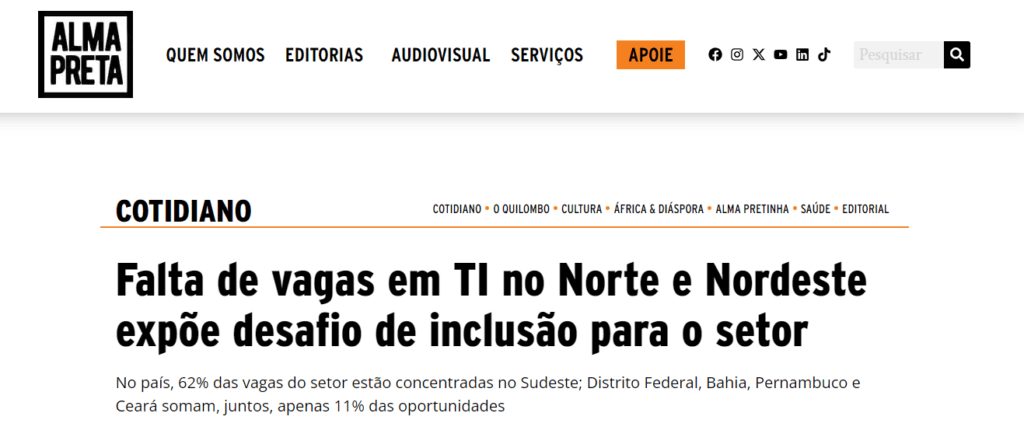 Ana Letícia Lucca, CRO da Escola da Nuvem, comenta a disparidade de oportunidades e desenvolvimento na área de TI nas regiões Norte e Nordeste em comparação ao Sudeste nesta reportagem publicada pelo Alma Preta. Segundo ela, a falta de infraestrutura dificulta o desenvolvimento e a expansão de empresas de Tecnologia nas regiões descentralizadas.