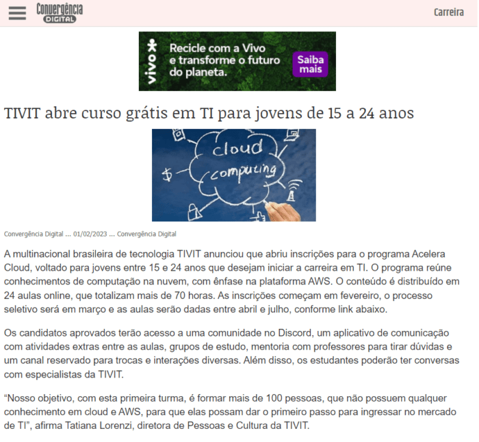 A multinacional brasileira de tecnologia TIVIT anunciou que abriu inscrições para o programa Acelera Cloud, voltado para jovens entre 15 e 24 anos que desejam iniciar a carreira em TI. O programa reúne conhecimentos de computação na nuvem, com ênfase na plataforma AWS. O conteúdo é distribuído em 24 aulas online, que totalizam mais de 70 horas. As inscrições começam em fevereiro, o processo seletivo será em março e as aulas serão dadas entre abril e julho, conforme link abaixo.