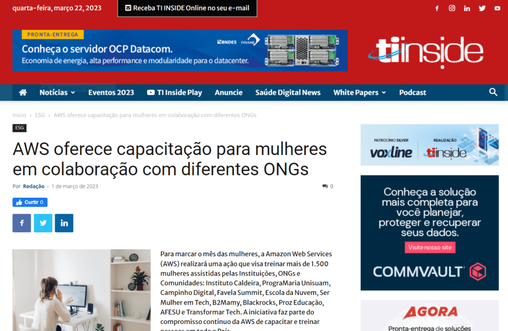 Para marcar o mês das mulheres, a Amazon Web Services (AWS) realizará uma ação que visa treinar mais de 1.500 mulheres assistidas pelas Instituições, ONGs e Comunidades: Instituto Caldeira, PrograMaria Unisuam, Campinho Digital, Favela Summit, Escola da Nuvem, Ser Mulher em Tech, B2Mamy, Blackrocks, Proz Educação, AFESU e Transformar Tech. A iniciativa faz parte do compromisso contínuo da AWS de capacitar e treinar pessoas em todo o País.